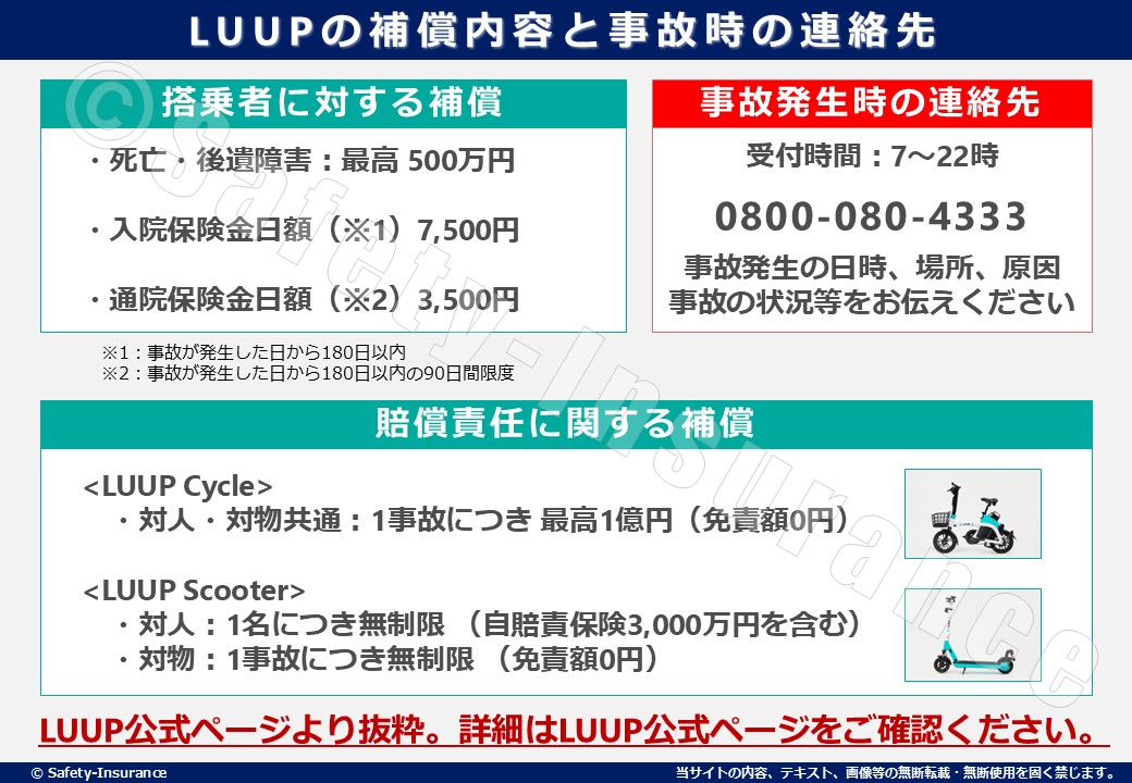 LUUPでは、死亡・後遺障害に対しては最高500万円、入院の場合は1日あたり7500円、通院の場合は1日あたり3500円が支払われる補償となっております。また、賠償責任に関する補償もあるため一定の安心感があります。(詳細はLUUP公式ページを参照)
