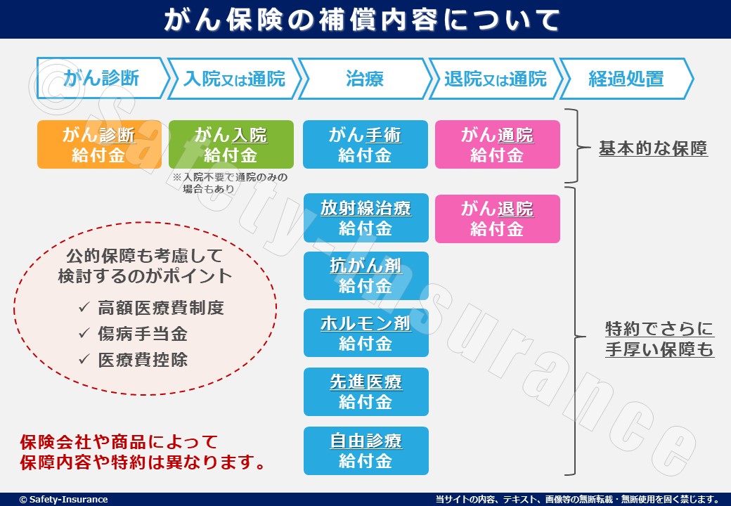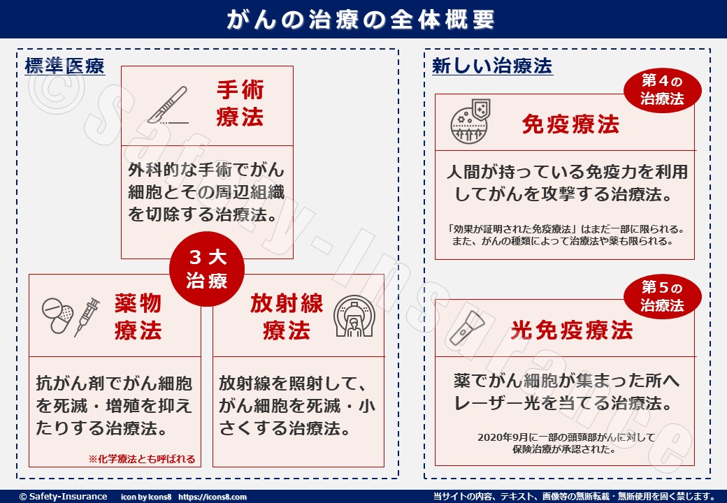 治療に関しては「手術」「放射線」が基本的な保障に含まれる事が多いですが、「抗がん剤」などの治療は保険会社によって特約扱いとなっていることが多いです。