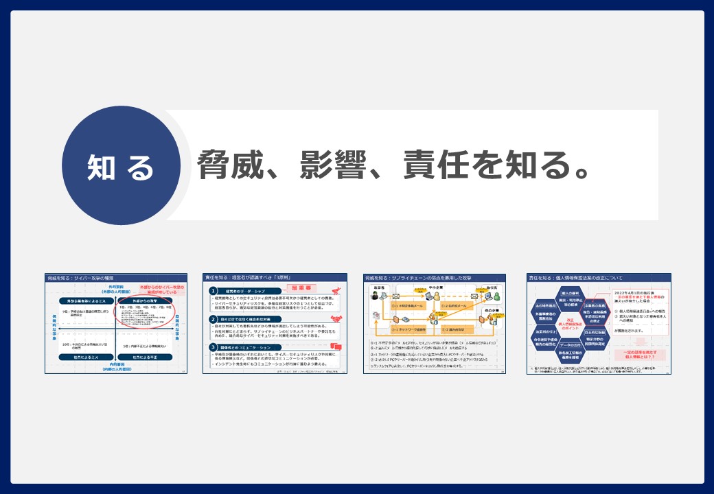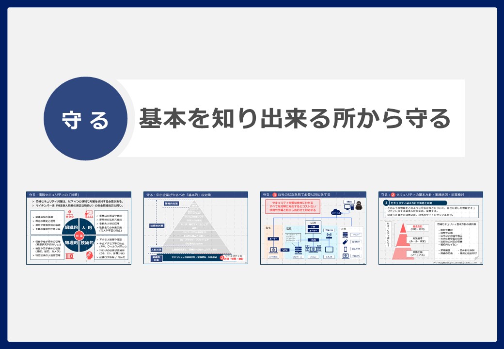 本セミナーでは、情報セキュリティ対策の基本を「知る」「守る」「備える」の3つの視点から、初心者でもわかる言葉で、実践的にご紹介します。