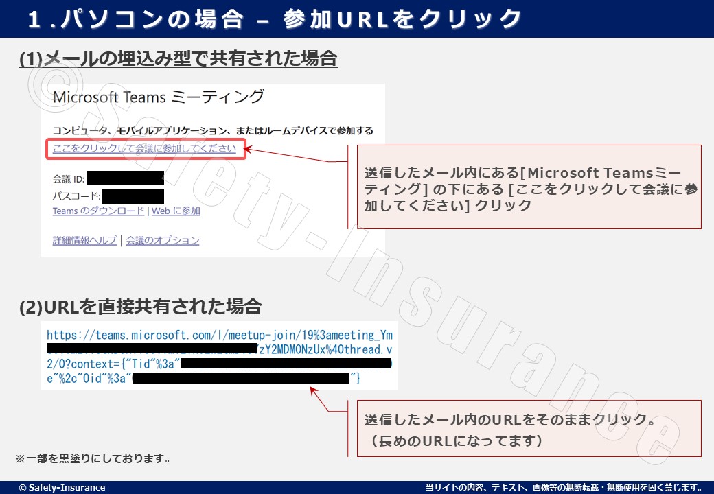 埋込み型の場合は、メール内にある[Microsoft Teamsミーティング] の下にある [ここをクリックして会議に参加してください] をクリックして下さい。