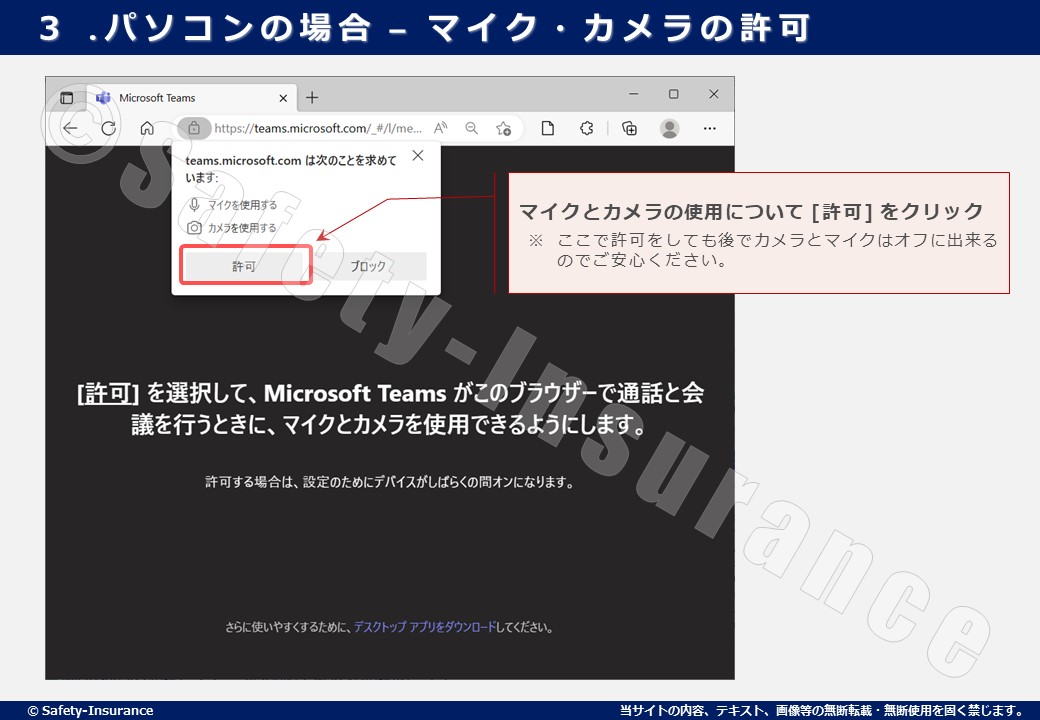 「teams.microsoft.com は次のことを求めています。マイクを使用する・カメラを使用する」の表示が出るので [許可] をクリックして下さい。