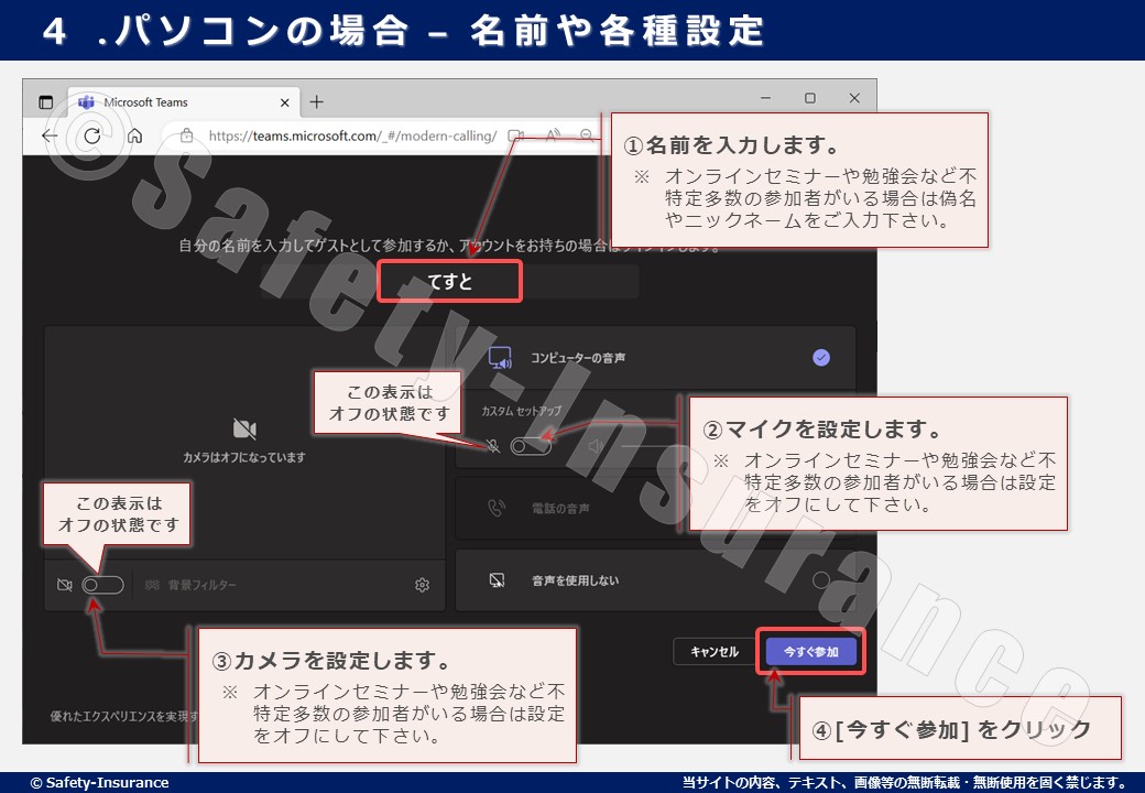 設定が完了したら [今すぐ参加] をクリックして下さい。