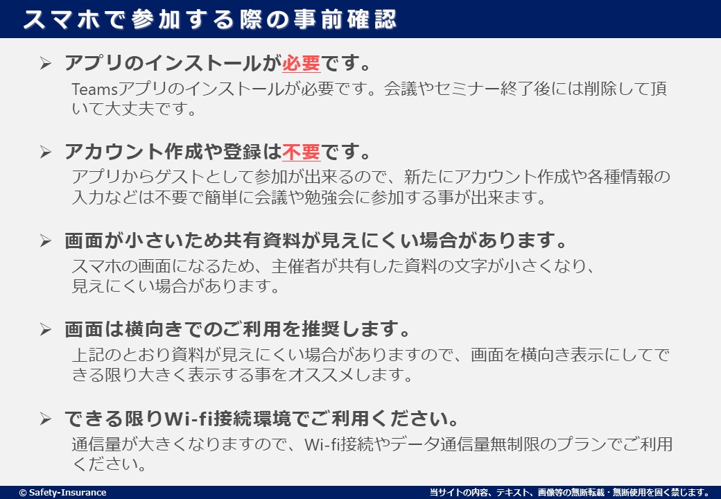 パソコン(PC)であれば手軽にブラウザから参加が出来ますが、スマートホン(スマホ)の場合は、以下の点を事前に確認してください。