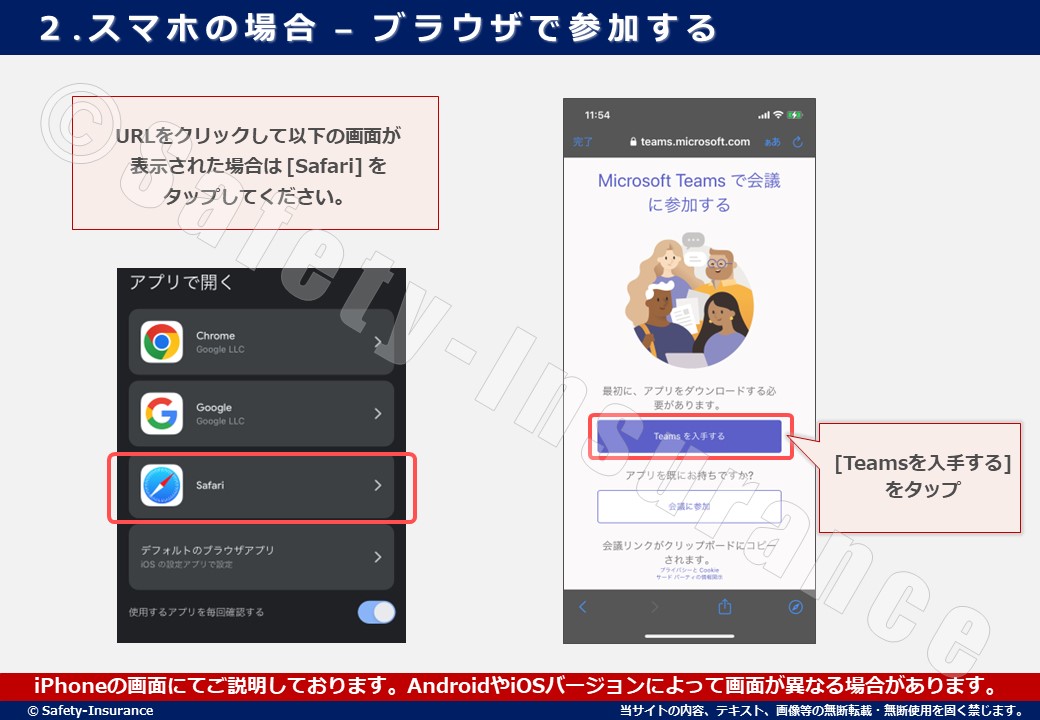 ブラウザのSafariが立ち上がると「Microsoft Teams で会議に参加する」画面に切り替わります。そのまま、[Teamsを入手する] をタップしてください。