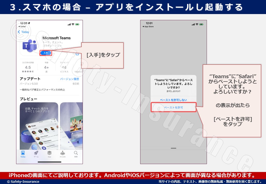 Teamsアプリのインストールが完了すると「“Teams”に”Safari”からペーストしようとしています。よろしいですか?」の表示がされるので、[ペーストを許可] をタップしてください。