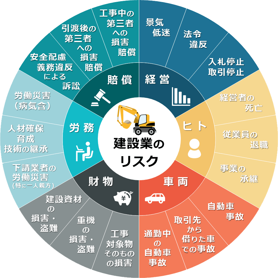 | 労働災害(病気含) | 重機が転回した際、横を通っていた作業員に、バケットが接触し負傷 | 安全衛生管理体制の構築、従業員教育の実施、業務災害総合保険等の検討 |