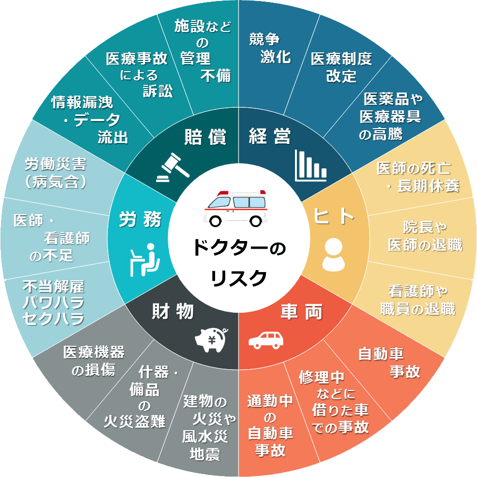 | 医師の死亡・長期休養 | 医師の離脱による経営の混乱、患者離れによる経営の悪化 | 後継者の育成、代診の先生の確保、事業承継対策、生命保険、所得補償保険、代診費用保険の検討など |