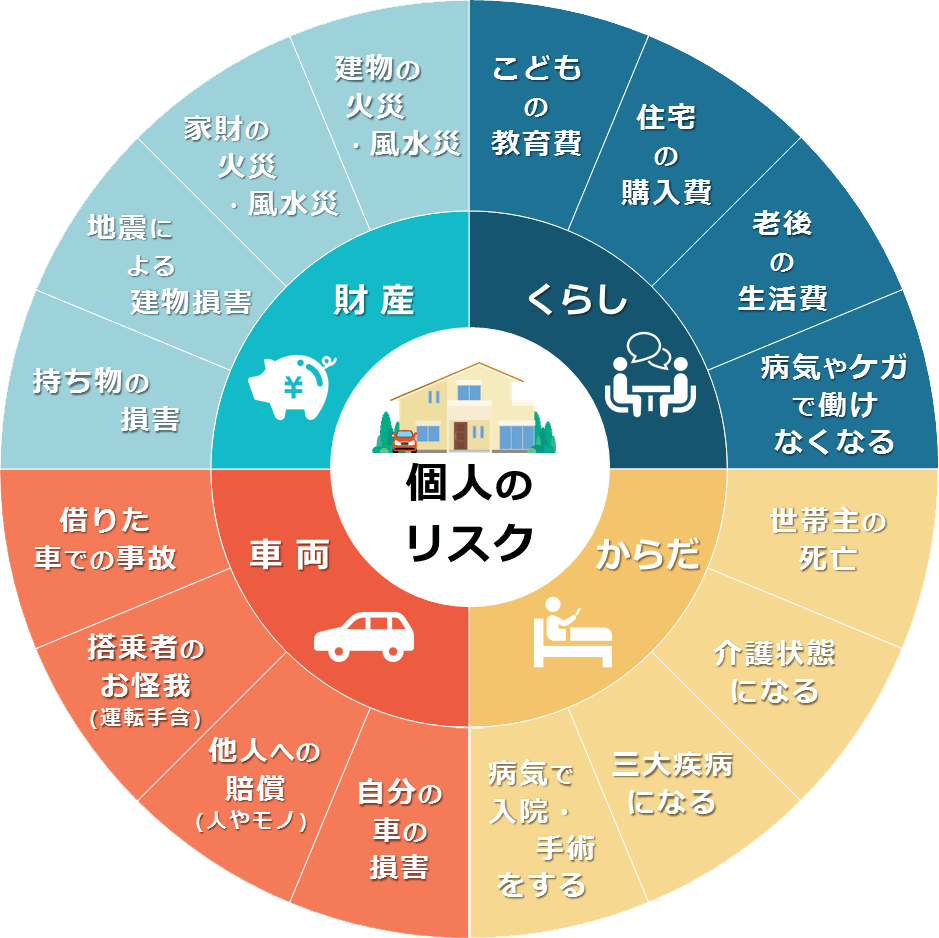 | 病気やケガで働けなくなる | 心筋梗塞で長期入院となり、休職せざるを得なくなる | 医療保険、所得補償保険等の検討 |